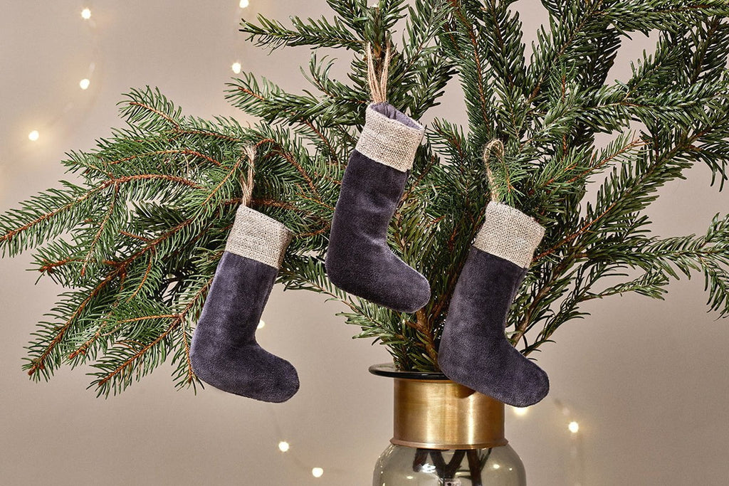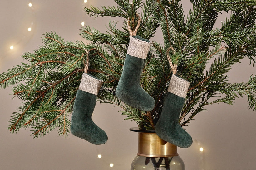The deep forest green hue of these Karru mini stockings sits perfectly alongside the traditional festive colour palette. Crafted from soft cotton velvet with a tactile linen border, their timeless quality means youll be able to enjoy decorating with them year after year. Cotton velvet is an eco-friendly alternative to polyester and linen has minimal environmental impact, making these mini stockings a stylish and sustainable way to decorate your tree.