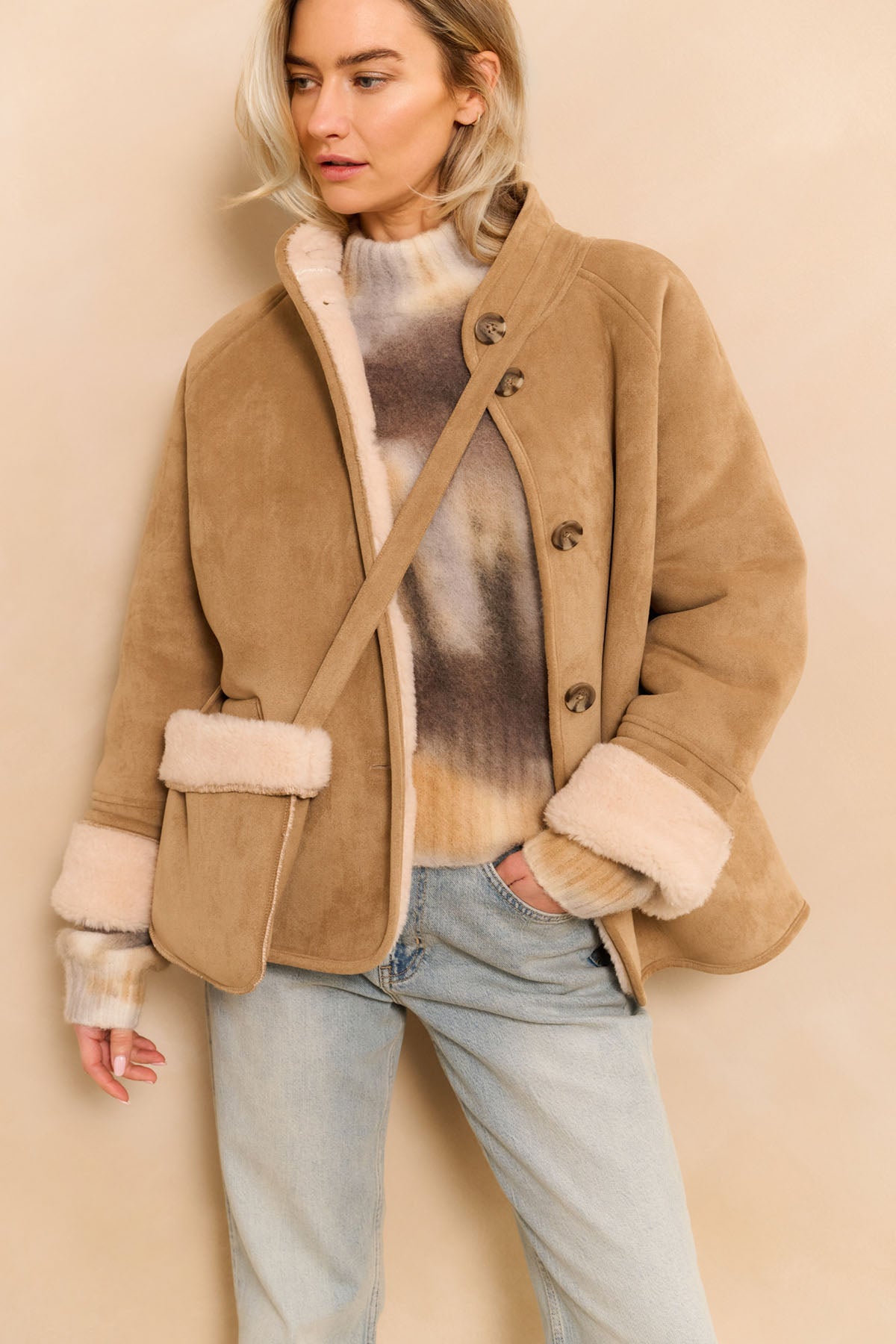 This oversized faux lammy coat is warm and stylish. It features raglan sleeves, a stand-up collar and button closure. The soft lining and turned cuffs add a cozy touch. Crafted from faux suede with a luxurious look. Perfect for chilly days. The model is 173 cm and wears size 2.