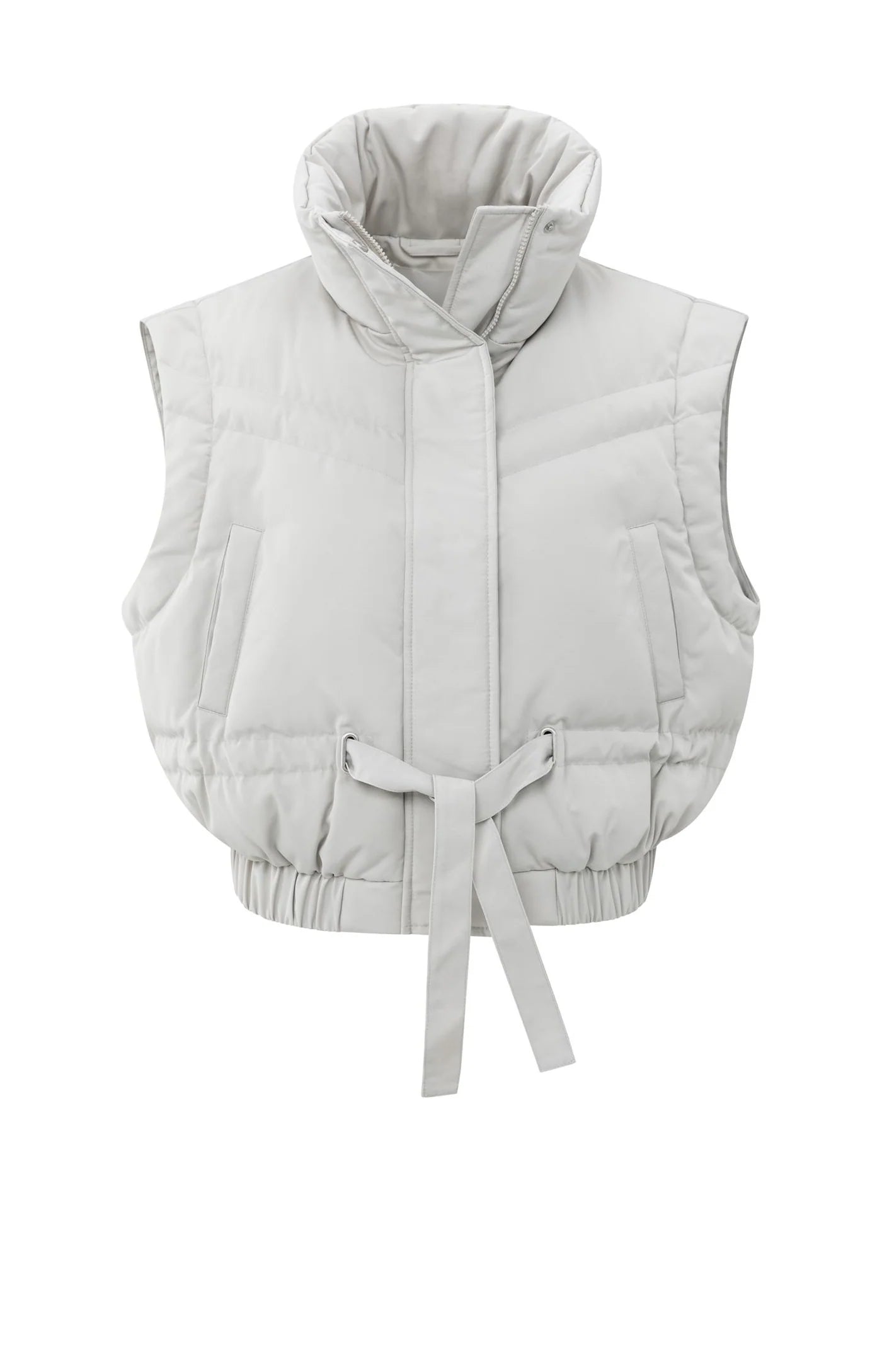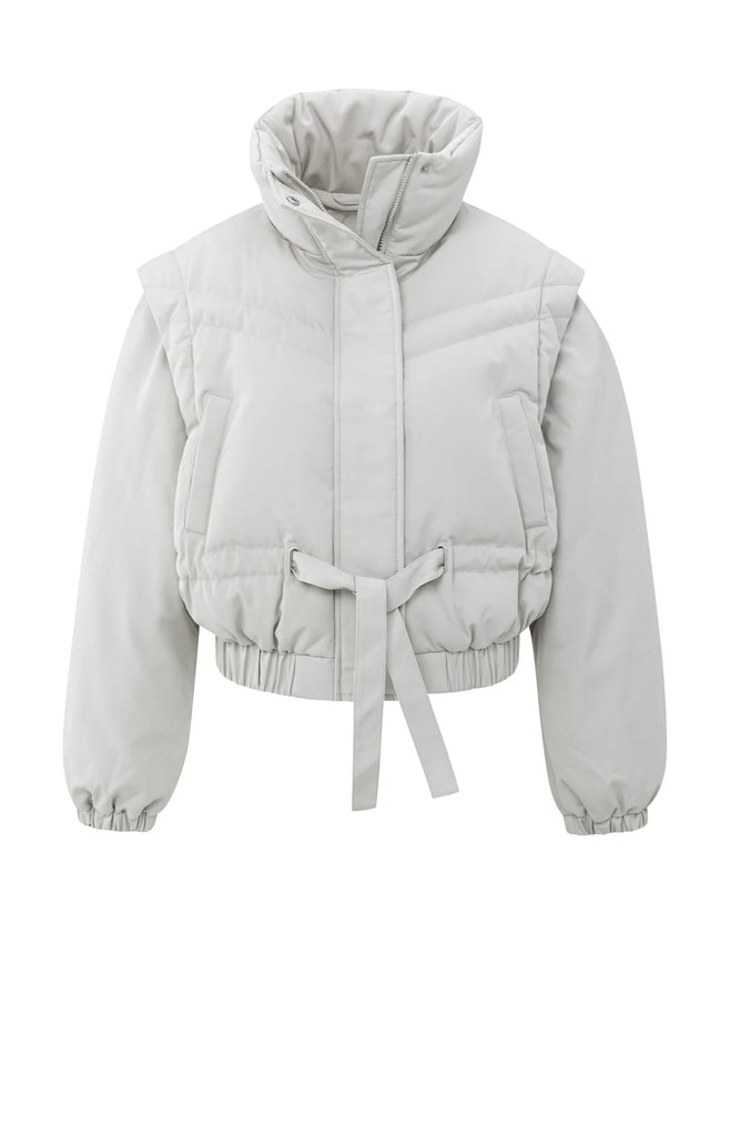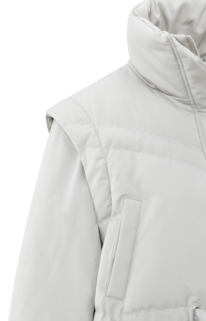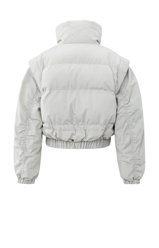This stylish padded jacket is crafted from a smooth nylon fabric and features a cropped silhouette with an oversized fit. Designed with a high collar, zip closure, side pockets and elasticated cuffs and hem. The zip-off sleeves transform it into a modern gilet, making it a versatile piece for transitional weather. The model is 173 cm and wears size 36.