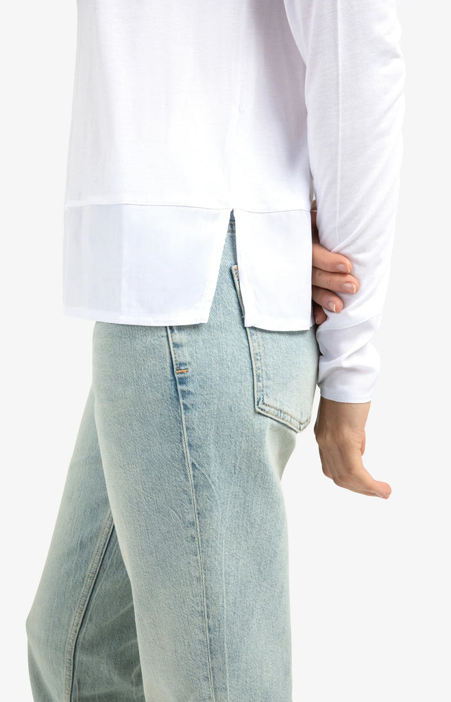 This comfortable top is crafted from soft jersey and features refined woven accents at the hem and sleeve cuffs. Designed with a round neckline, long sleeves, and a straight fit. The subtle contrast in textures adds a modern and elevated touch. Perfect for creating a casual yet polished look. The model is 178 cm and wears size S.