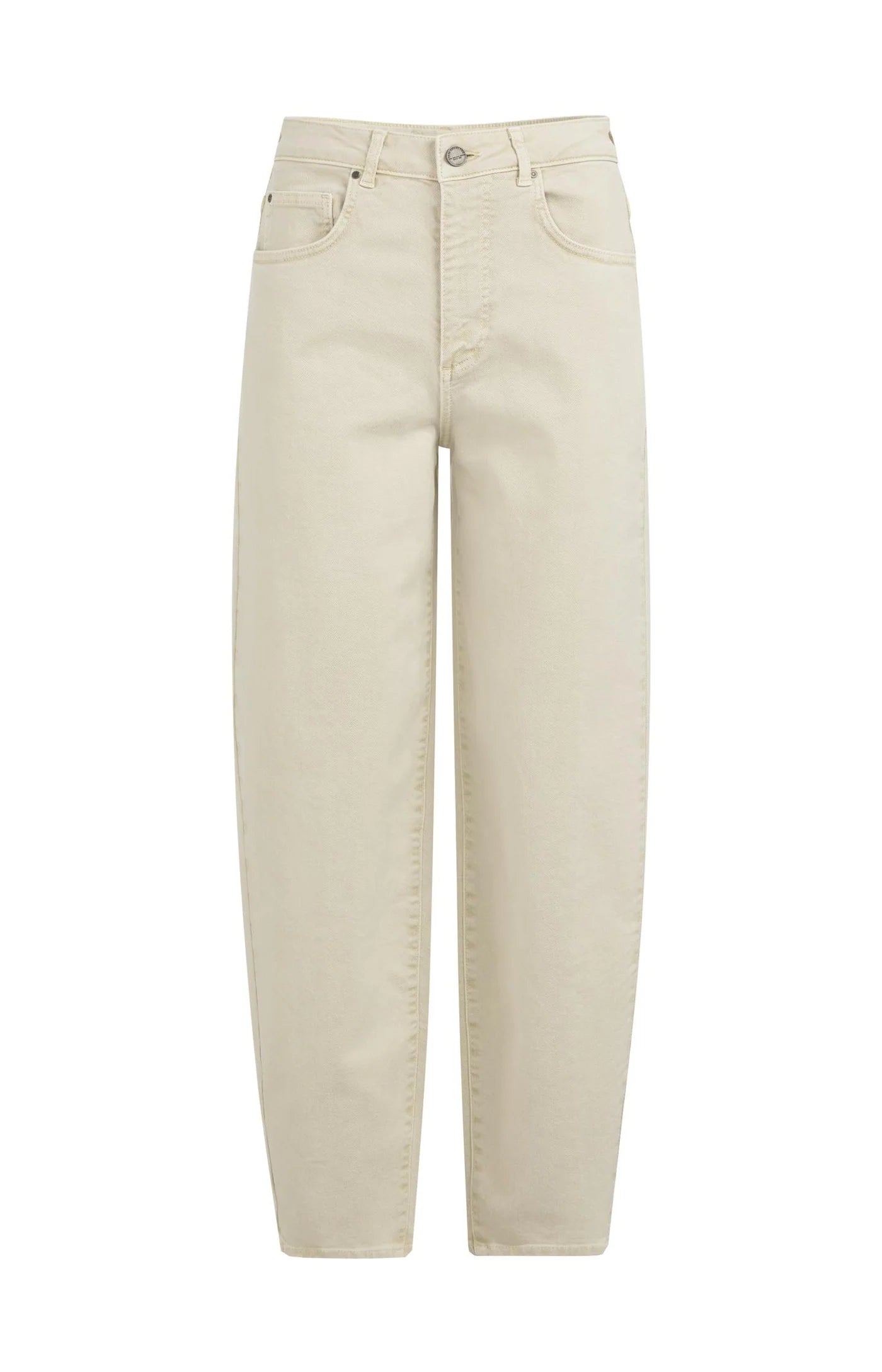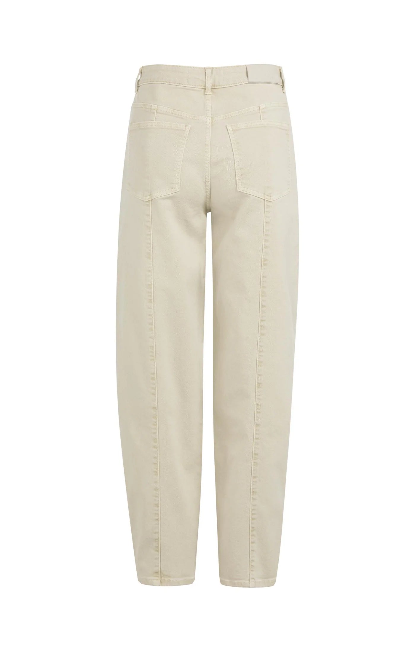 These jeans are crafted from a comfortable denim quality and feature a high waist and a loose barrel fit. The trousers are designed with visible seams at the back, front slit pockets and patched back pockets. The tapered legs add a contemporary touch. A stylish and casual piece with a light wash for a soft, relaxed look.