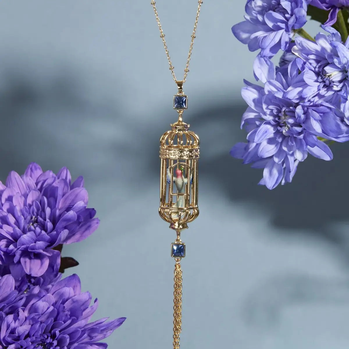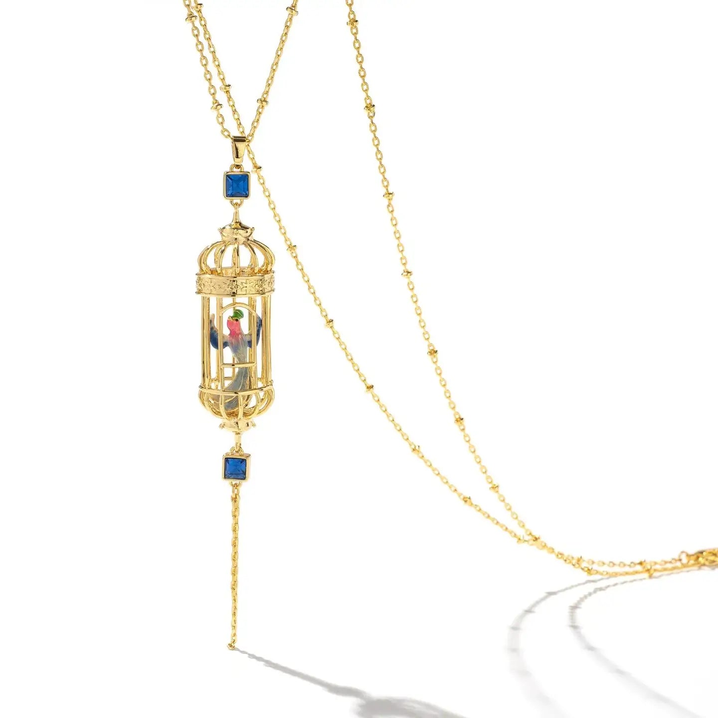 This bird cage drop pendant demonstrates Bill's expert craftmanship. A hand enamelled bird sits inside an intricate gold plated cage. Presented on an 18ct gold plated bead chain with delicate gold tassels this pendant is a real taking piece. Style with the matching bird cage drop earrings.