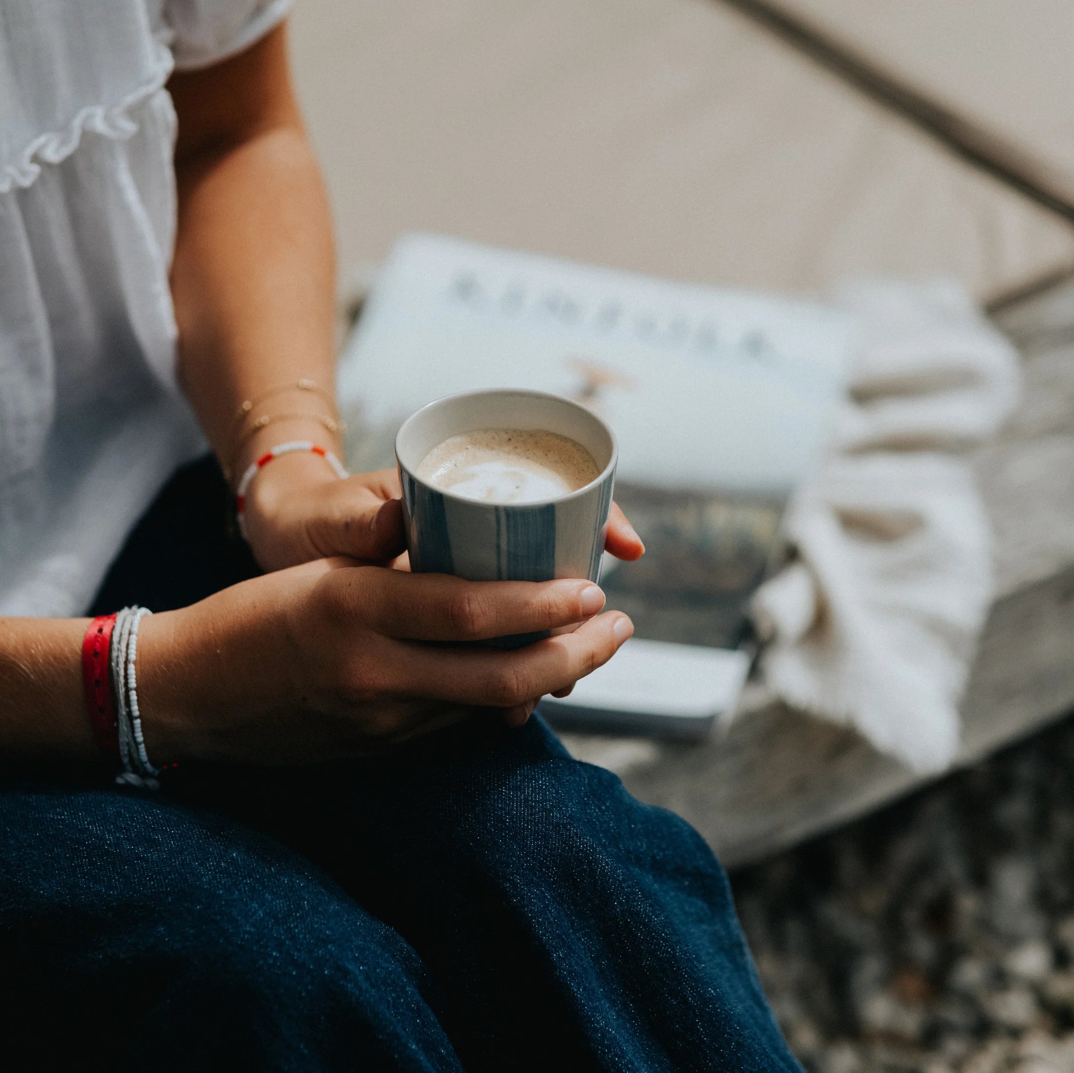 The smooth ceramic glaze feels great to the touch, and their gently curved shape fits naturally in your hands. Thoughtfully designed to stack easily. Hand-painted wide and broken brushstroke stripe design.