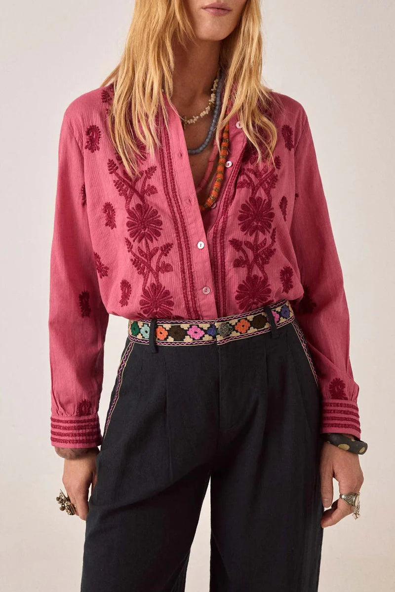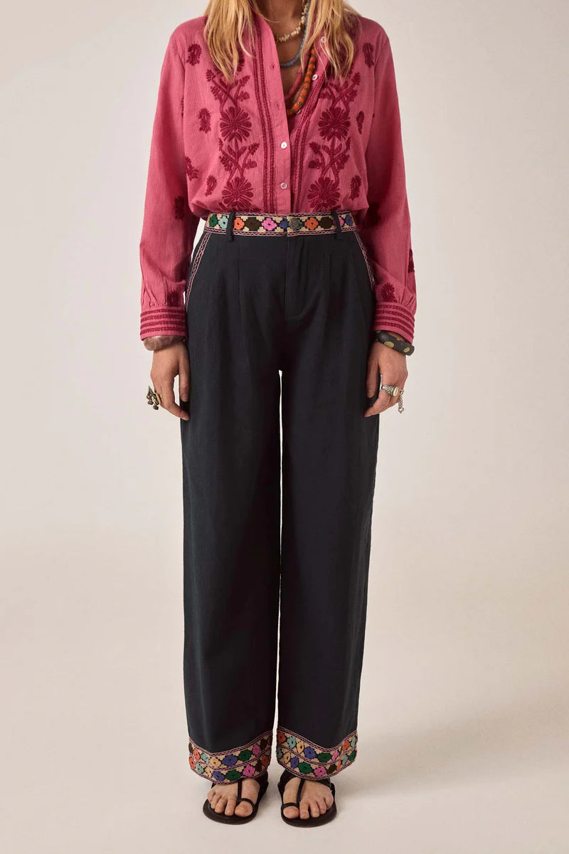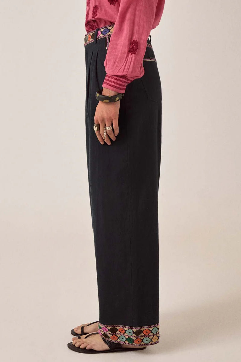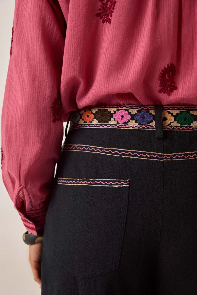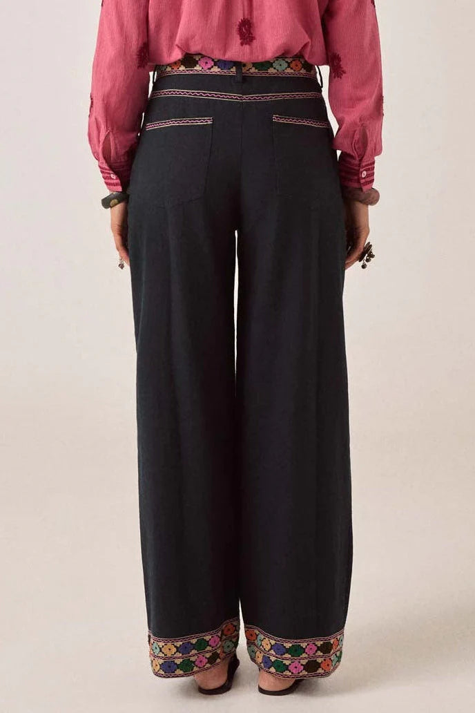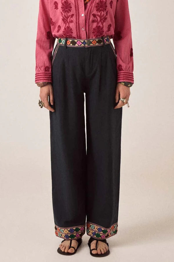 Wide-leg pant in a dark cotton base — near-black, flat, grounding. Hand-embroidered florals break through at the waistband and ankles in concentrated bursts of red, yellow, blue, and green. The rest stays clean.