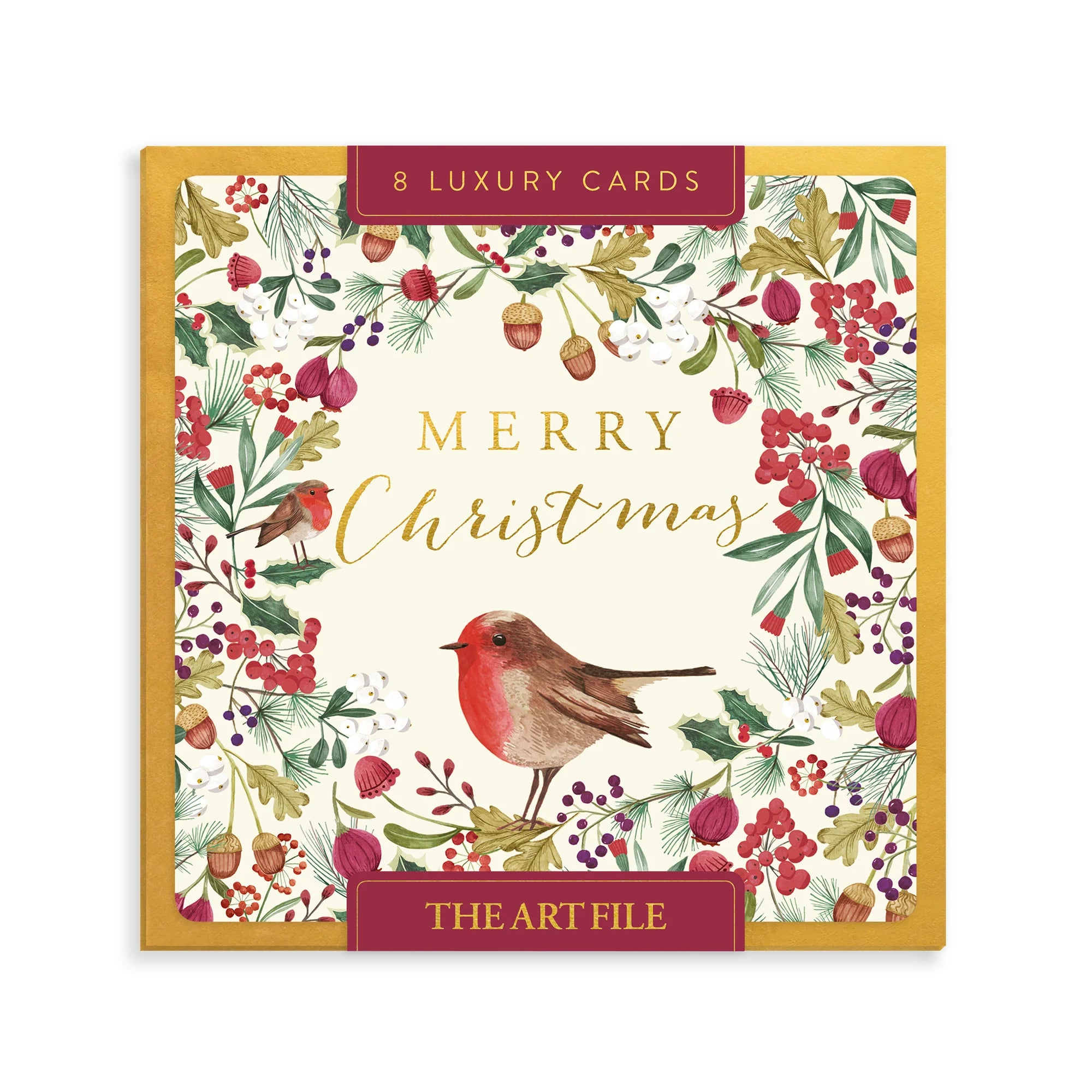 These elegant cards are perfect for those wanting to send a higher quality Christmas cards. This box contains 8 luxury Christmas cards that feature a festive robin surrounded by a wreath of botanicals.