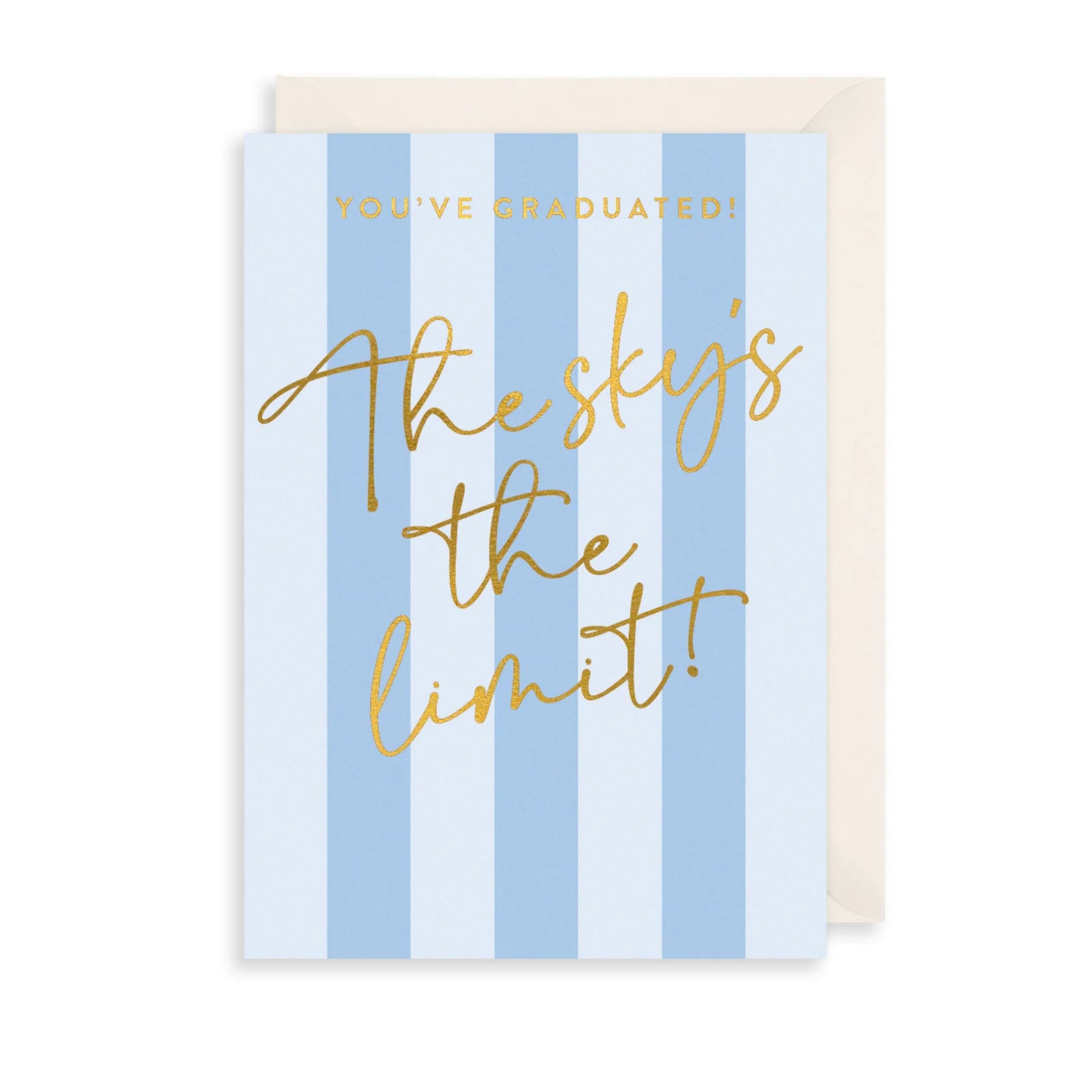 Say congratulations with this lovely graduation card. This beautiful foiled card features luxurious gold calligraphy that reads "You've Graduated! The sky's the limit"
