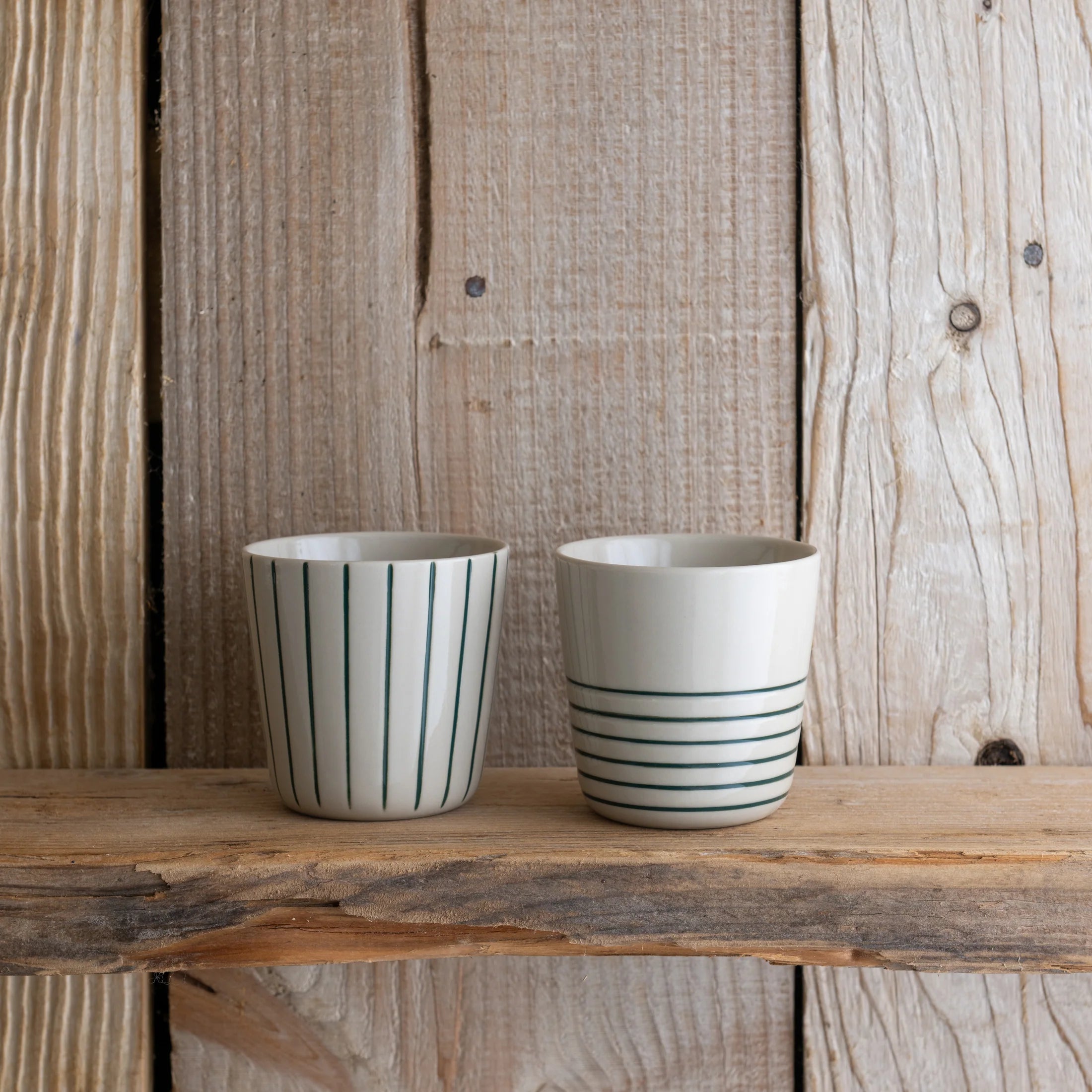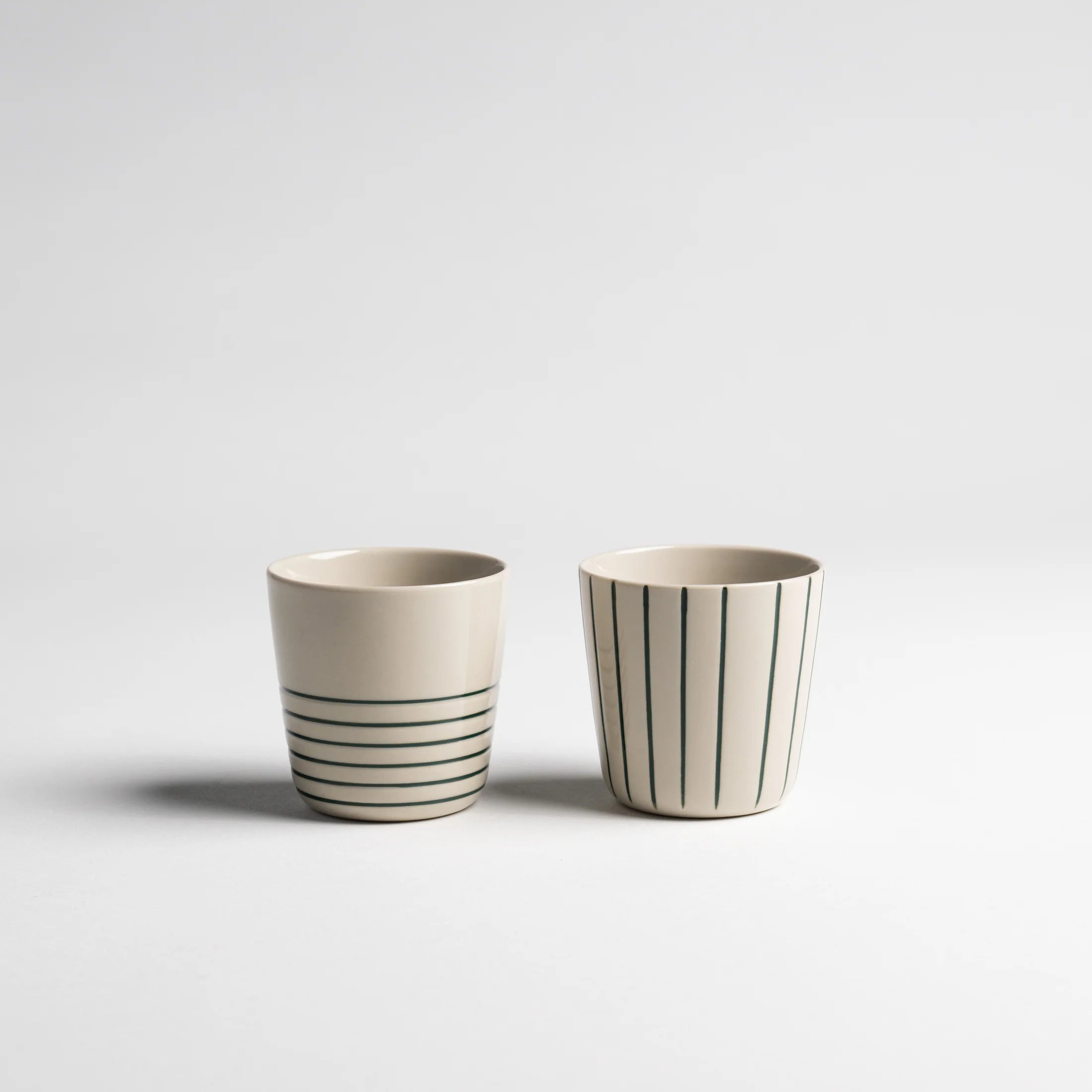 Each beaker features hand-etched patterns — one with bold vertical lines, the other with a soft circular design — etched using simple tools and hand-painted with care. The smooth gloss finish feels beautiful to hold, while the subtle imperfections of the handmade process make each one uniquely yours.