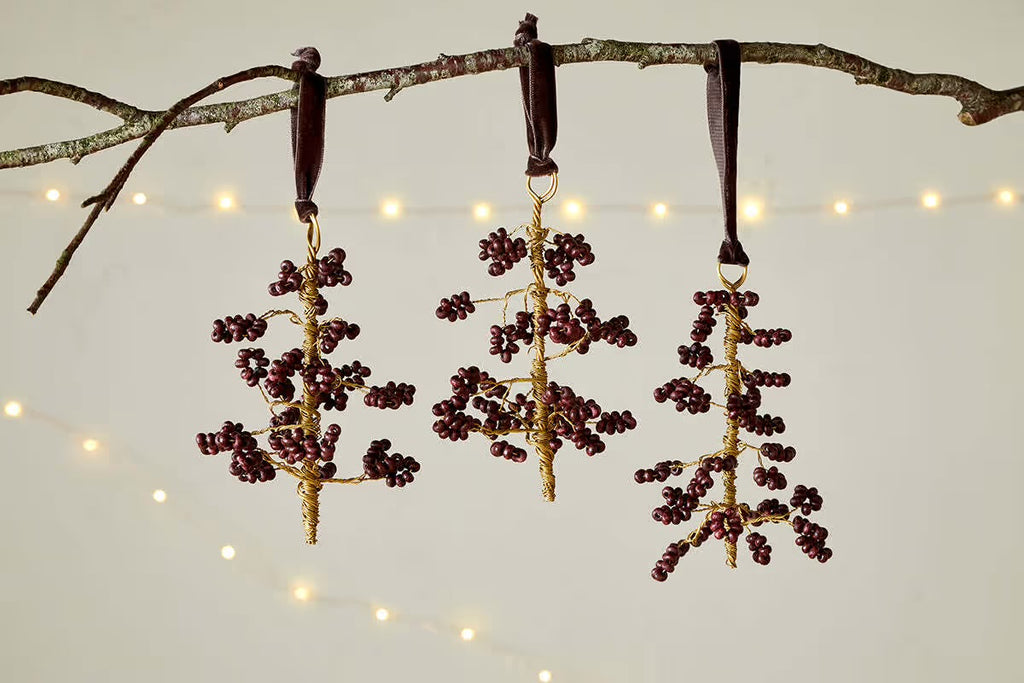 With a form that echoes the shape of a Christmas tree, these decorative baubles combine mango wood beads and antique brass-coloured wire in a delicate, foliage-inspired design. Their soft texture and warm tones add a natural elegance to festive trees, garlands, or table settings.