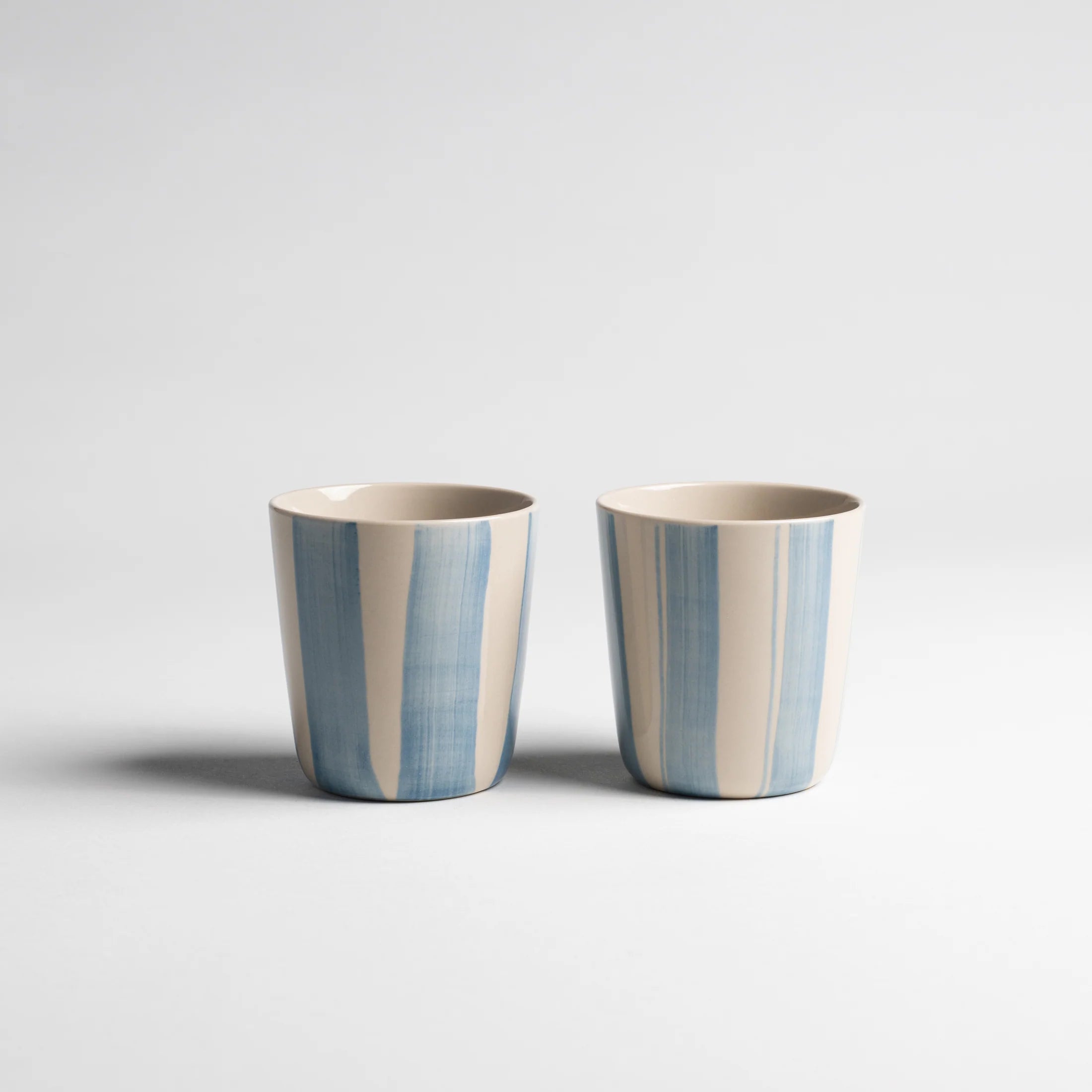 Each one is hand-painted with brush-painted stripes — one solid, one with a playful broken line — giving every beaker its own personality. The smooth ceramic glaze adds a soft tactile feel, while the gently curved shape makes them a joy to hold and easy to stack.