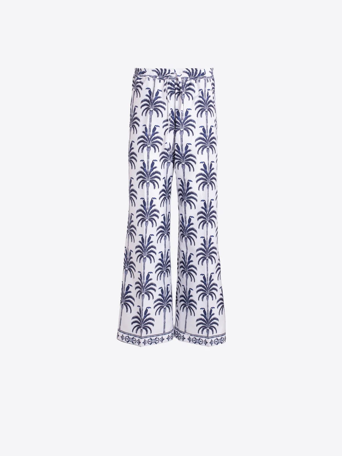 Wide-leg straight trousers with a toucan and palm tree print in navy blue on a white background. Wide leg and elasticated waistband with adjustable drawstring. Hem with a decorative trim.