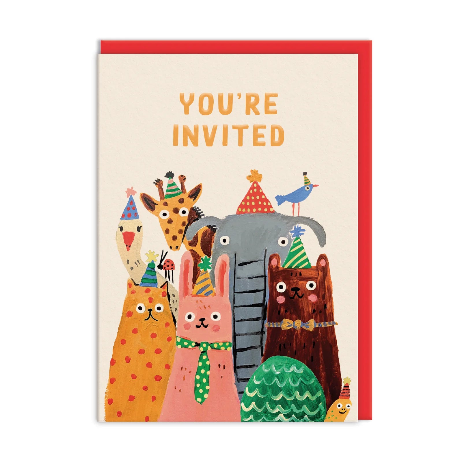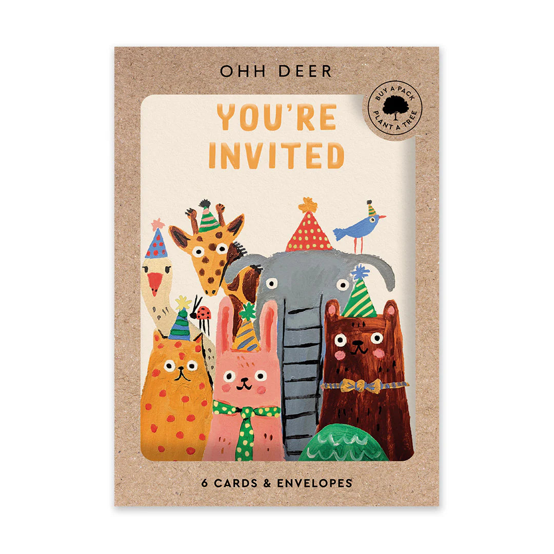 Get ready to throw the most unforgettable party with our You're Invited Party Animals Invitation Card Set! This set includes 6 beautiful cards and envelopes featuring adorable animals in party hats, designed by Emily Doliner. Each card is finished with a touch of elegance with gold foil. These invitations will surely impress your customers and their guests.